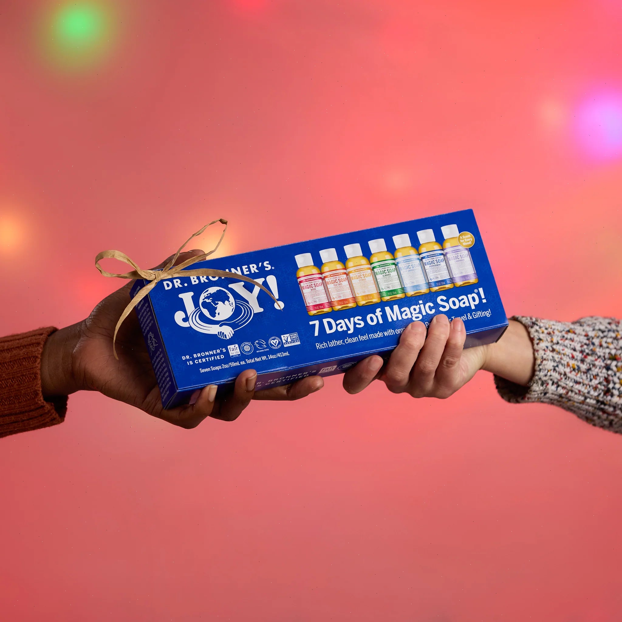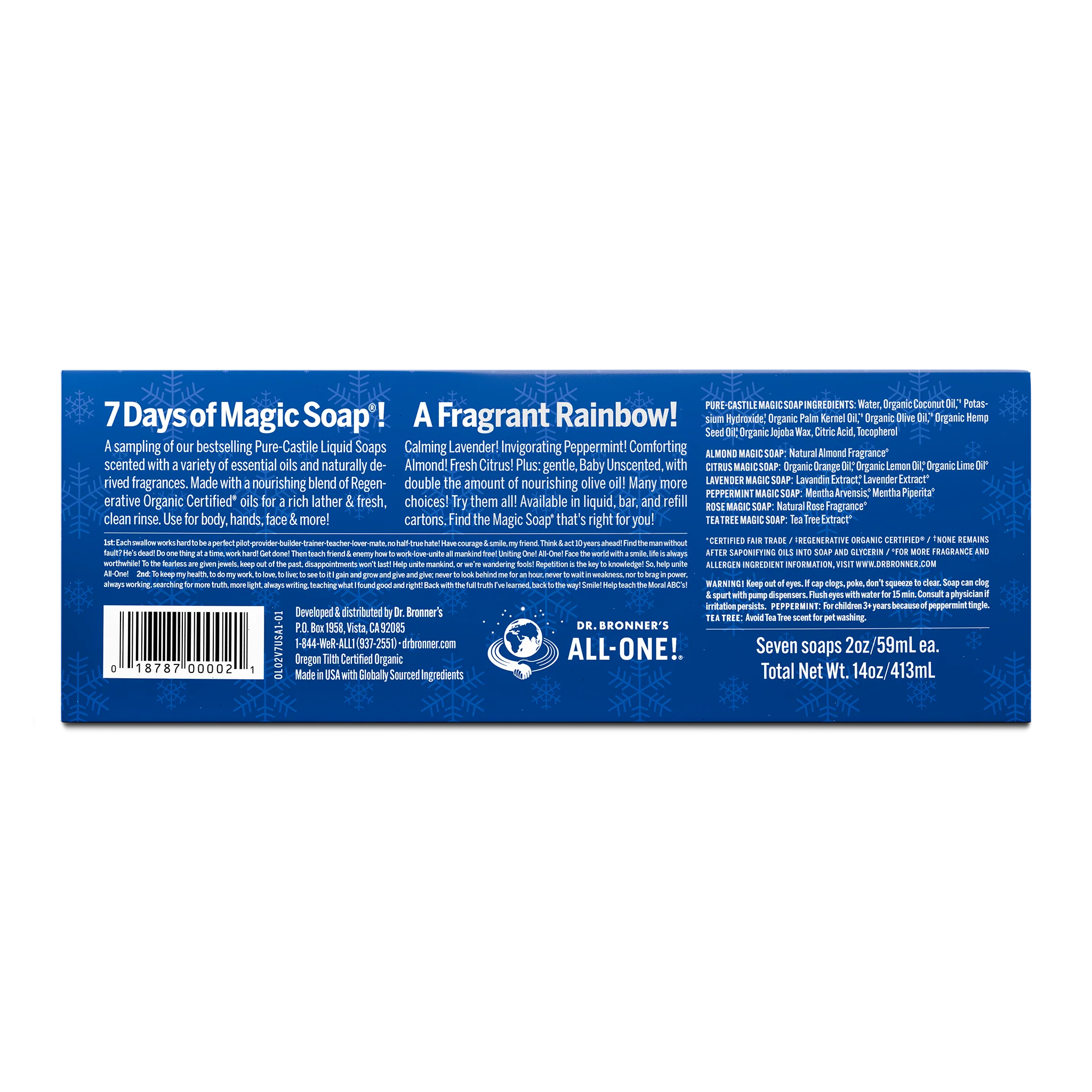 A sampling of our bestselling Pure-Castile Liquid Soaps scented with a variety of naturally derived fragrances. Perfect for travel and gifting! Made with a nourishing blend of Regenerative Organic Certified® oils, these true soaps create a rich, smooth lather that rinses clean—leaving skin feeling fresh and renewed. Great for everyday use and crafted with ethically sourced, organic ingredients, these soaps and contain no detergents, dyes, or added foaming agents. Vegan, made with organic oils, fair trade, and EWG Verified® for peace of mind—because caring for your body should also care for the planet!