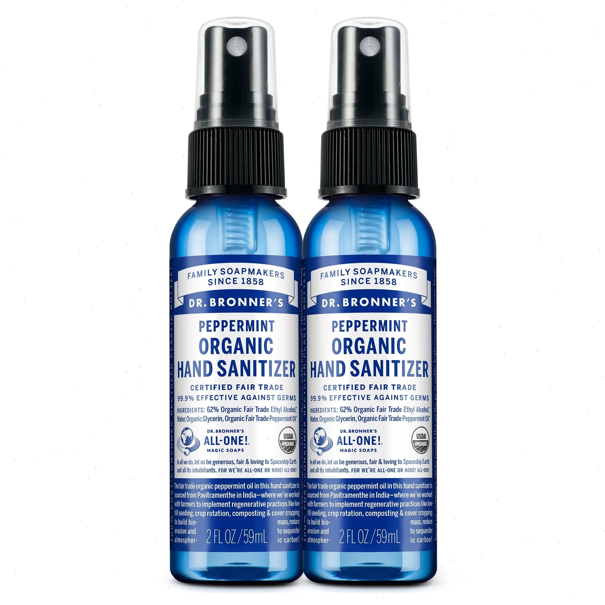 Our Organic Hand Sanitizer helps reduce bacteria on the skin with a simple formula: organic ethyl alcohol, water, organic peppermint oil, and organic glycerin - that’s it! None of the nasty chemicals you find in conventional sanitizers, but just as effective. Our Organic Hand Sanitizer is perfect for using on the go and even as an air freshener or deodorant. Sanitize with a clean conscience. All-One!